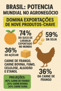 O Brasil se consolidou como líder global em diversas cadeias do agronegócio. De acordo com estudo da Harven Agribusiness School, com base em dados da FAO, USDA e Ministério da Agricultura, o país domina as exportações de nove produtos-chave no mercado internacional.