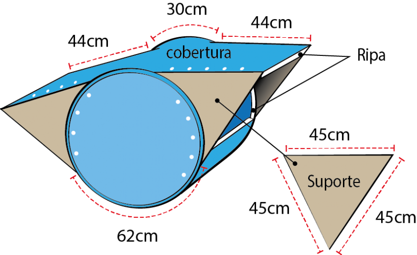A chapa triangular, dessas utilizadas para confecção de calhas (0,5 mm de espessura), é presa na bombona com rebites. Recomenda-se passar uma camada de veda-calha, para impermeabilizar. “Não entra água de modo algum”, garante Vilela. A tampa do tambor também é fixada nele com rebites, para fechar sua boca e formar uma das paredes do cocho.