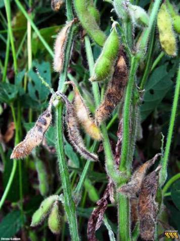 Nas vagens ocorrem lesões escuras de formato irregular e com depressões. Estes danos podem afetar os grãos ou as sementes do interior da vagem.