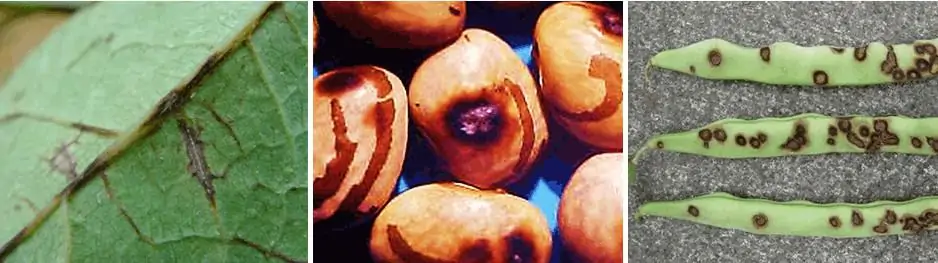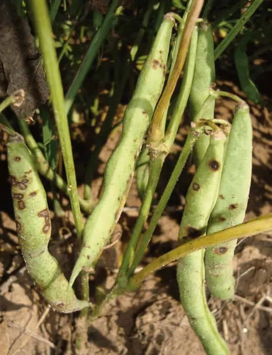 Já nas vagens, as lesões são deprimidas, circulares, com borda escura (marrom ou avermelhada).
