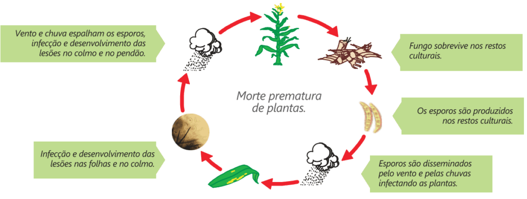 Já a manutenção do inóculo (patógeno) na área ocorre preferencialmente por restos de culturas e por hospedeiros alternativos.