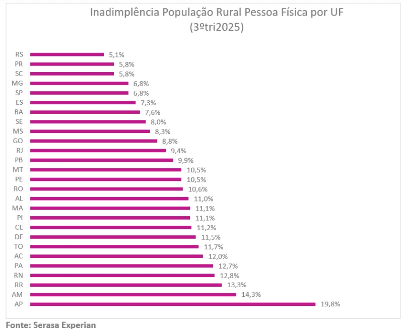 Na visão por Unidade Federativa (UF) o Rio Grande do Sul teve melhor desempenho, com apenas 5,1% de taxa de inadimplência, seguido pelo Paraná e Santa Catarina. Por outro lado, o Amapá registrou o maior percentual, com 19,8%.